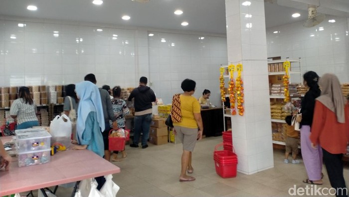 Untuk memenuhi tingginya permintaan, pihak toko menyiapkan stok berbagai jenis kue kering. Kue-kue tersebut terpantau cepat habis, sehingga pekerja toko terus melakukan pengisian ulang kemasan di rak penjualan.