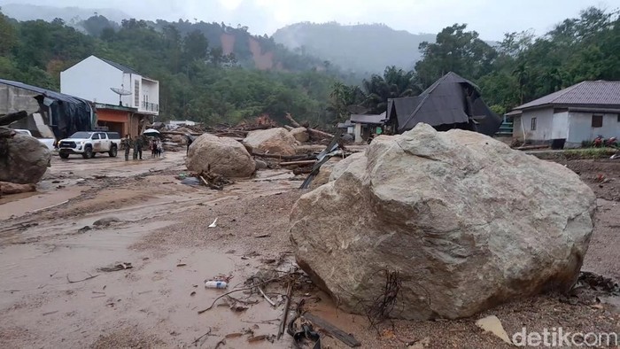 Selain itu, gelondongan kayu dengan ukuran besar juga terlihat di lokasi. Batu dan kayu itu terbawa arus banjir bandang sehingga menyapu rumah-rumah warga.