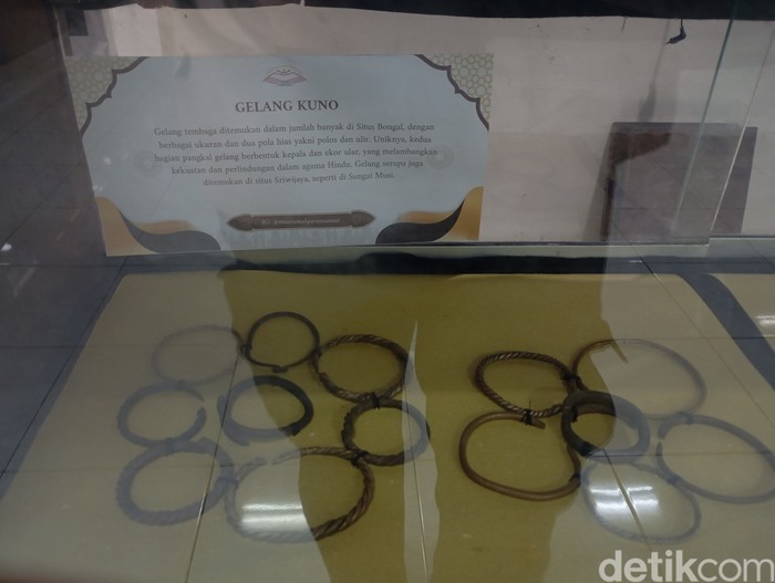 “Gelang tembaga, ditemukan dalam jumlah banyak di Situs Bongal, dengan berbagai ukuran dan pola hias yakni polos dan ulir. Uniknya, kedua bagian pangkal gelang berbentuk kepala dan ekor ular. Gelang serupa juga ditemukan di Situs Sriwijaya, seperti Sungai Musi, ” keterangan museum.