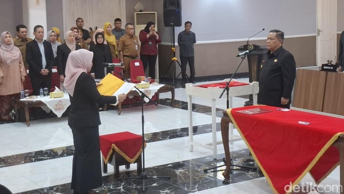 Pelantikan 14 pejabat berlangsung di Balai Pauh Janggi, Jalan Diponegoro. Terlihat 14 pejabat yang dilantik hadir langsung dengan setelan jas hitam.